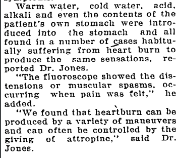 I did however find this newspaper article from the Washington Post published in 1926 that somewhat tries to answer this question. The headline read, “HEARTBURN IS LAID TO MUSCLE SPASM, NOT ACID STOMACH: Warm and Cold Water, Alkali and Other Substances Have Same Effect.”