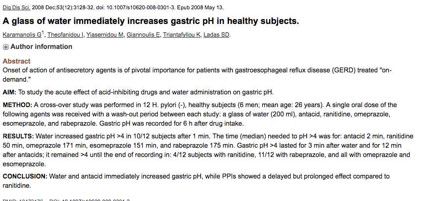 I also found this cross-over study on 12 healthy subjects that showed drinking water increased the stomach’s pH to >4 in less than one minute. This alkalizing effect (higher pH= more alkaline, less acidic) of water dissipated by 3 minutes.