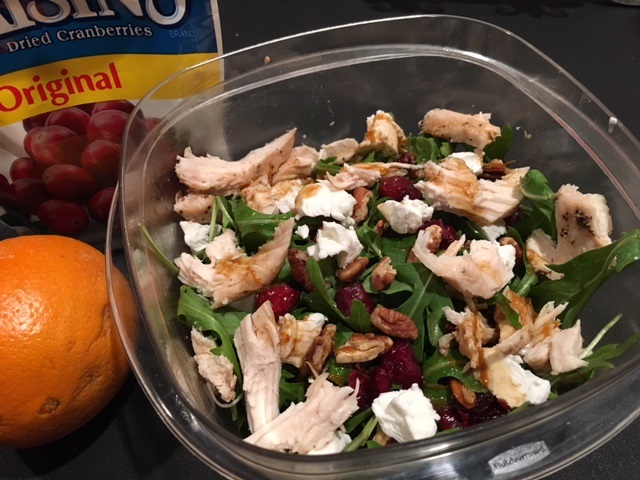 This arugula craisin salad has a great balance of flavors and textures…peppery arugula mixed with sweet and tangy craisins, soft and milky goat cheese and crunchy, nutty pecans. I like to add baked or grilled chicken and pack it for lunch.