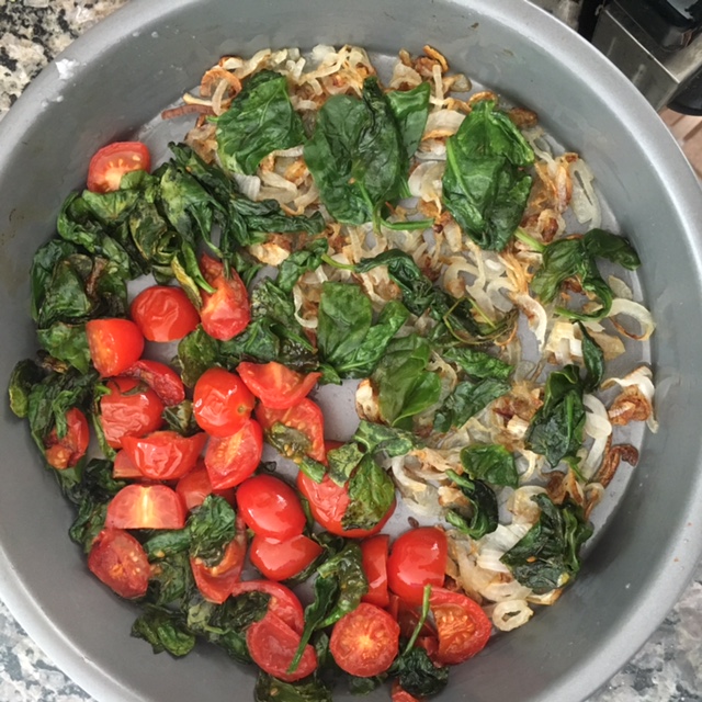 - Add onion and saute for 5-minutes. Then, add tomatoes and saute for 5-minutes. Lastly, add spinach and saute until the leaves are wilted.