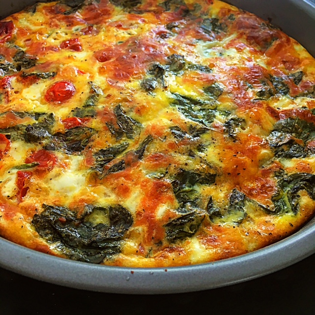In this case I made half of the quiche with sliced cherry tomatoes and spinach and the other half with sliced onions and spinach. You can certainly use any vegetable that you enjoy or have on-hand like mushrooms, bell peppers, or arugula. Simply saute your favorite veggies until softened in some olive oil. You can also chop up cooked bacon or sausage and add it to the quiche.