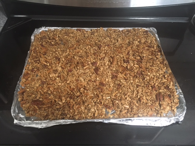 - Pour the granola onto the baking sheet and spread it out evenly all the way to the edges. Bake for 75-minutes and toss it around every 30-minutes.