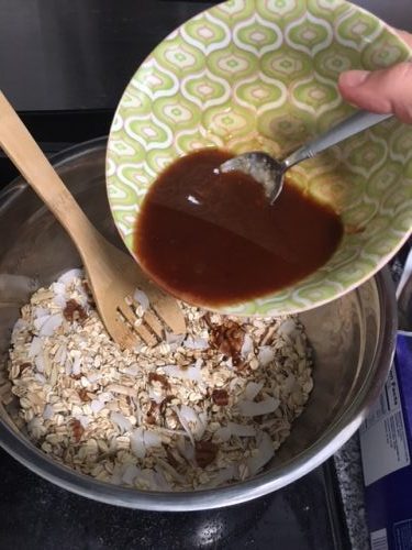 Combine all of the dry ingredients into a large mixing bowl. Add the melted coconut oil, pure maple syrup in a separate bowl. Mix the two bowls together until well combined.