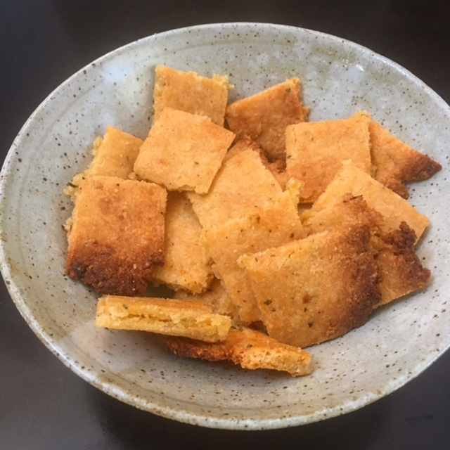 Toss all of the ingredients into a mixing bowl and combine until you get your cracker dough. Press the dough onto a baking sheet and flatten it out evenly. You’ll want your cracker dough to be about 1/2 cm thick. Toss it in the oven until it is nice and crispy and ready for slicing! It is best to slice the crackers with a pizza cutter while they are still warm; otherwise, the crackers may be tough to cut.
