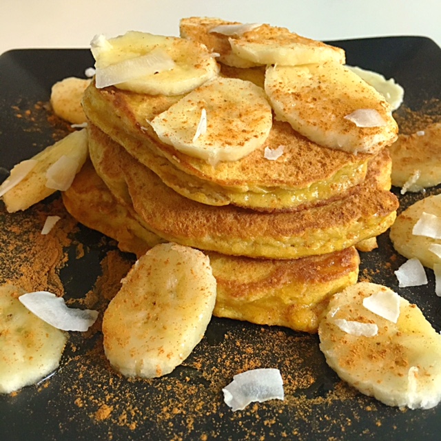 These pancakes are light, fluffy and flavorful. You can top them with nuts, seeds, and fruit to your liking for extra flavor, texture and fiber. Here I chose banana slices, unsweetened coconut flakes, pure maple syrup, and a hint of cinnamon. Try out topping combinations like fresh, wild blueberries with chopped walnuts or sliced strawberries with slivered almonds or even chopped fresh peaches with toasted pecans. In place of maple syrup you may also use a light drizzle of honey or agave syrup for extra sweetness.