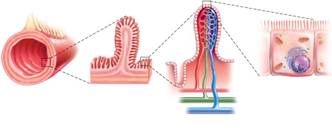- These small particles are absorbed into the body by passing through the digestive tract’s brush border. To picture this, think of a shag carpet lining the inside of a tube! Each tiny carpet strand, called the villi and microvilli, provide surface area where these tiny particles may pass through to circulation.