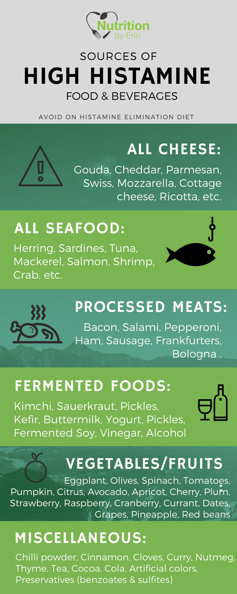 Remember that while some foods naturally contain high histamine levels, like in the chart above, other foods promote the body’s immune cells to release more histamine. Remove both types of foods to get the most relief from symptoms.