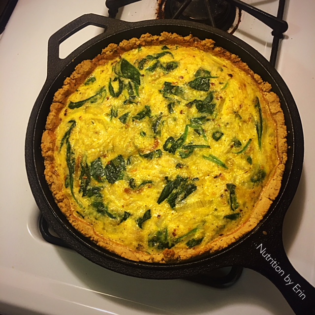 Fill the quiche with sautéed onions and spinach for extra fiber and nutrients. Bake for about 30-minutes and allow it to cool completely before slicing.
