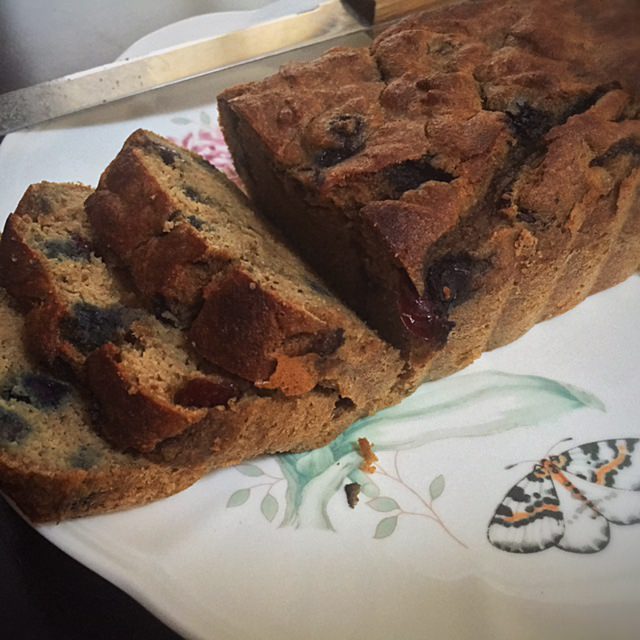 Banana bread is one of those desserts that easily passes as a quick breakfast as it at least provides some fruit to the diet! Many banana bread recipes add in chopped walnuts, chocolate chips, or other flavors/textures. In my recipe I added a berry twist! I tossed in wild blueberries and dried cranberries adding a unique tanginess to the banana bread. Yum.