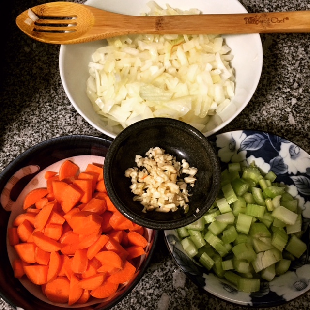 Prepare this recipe in the crockpot or on the stovetop depending on your timeframe and kitchen supplies. To start, prep your vegetables by dicing the carrots, celery, and onion and mincing the garlic cloves.