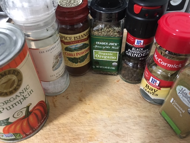Now it is time to add the seasonings: chili powder, bay leaves, cumin, and oregano. Throw in the broth, beans and pumpkin puree and mix all of the ingredients together until well combined. At this point, your kitchen will already start smelling amazing!