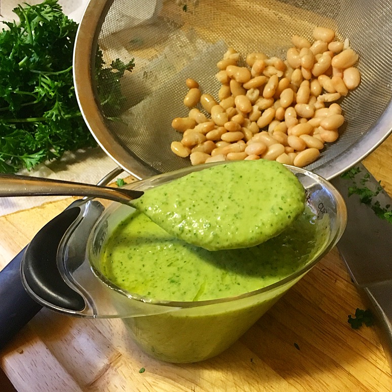 First, the sauce…just toss together oil, water, salt, lime juice, fresh herbs, garlic and white beans. Puree until fairly smooth and you have the tastiest sauce in town! You can pour this stuff on anything to make it taste better 🙂