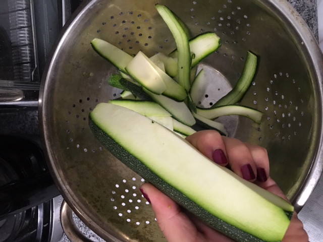 Peel your zucchini lengthwise with a vegetable peeler into a strainer. There is no need to peel off the skin of the zucchini unless you want to avoid the dark green color in your zoodles. The skin also adds more color and nutrients to your dish! Peel on one side of the zucchini until you hit the inside seeds, and then turn the zucchini a bit and keep peeling! Make thin strands throughout the entire zucchini until you end up with just the inner seed section, which may be thrown away.