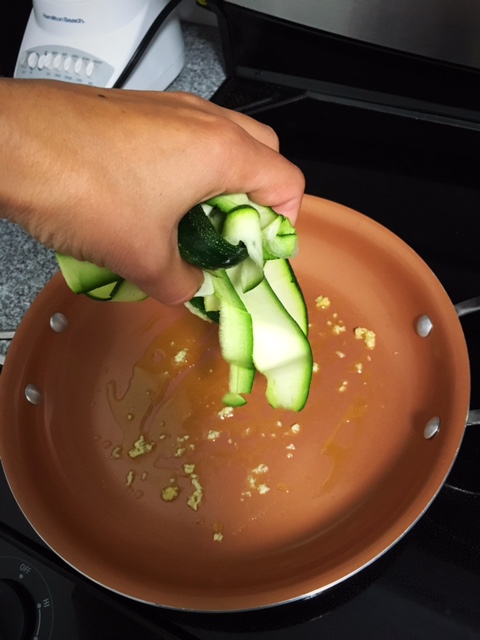 Meanwhile, set up a saute pan and place it on medium to medium-low heat. Add 1 tablespoon of extra virgin olive oil to the pan. Then, add 1 clove of minced garlic to the heated oil. I like to use my garlic press because it makes this process go super fast! Next, add the dried zoodles to the pan and allow them to heat in the garlic and oil for about 2-minutes.