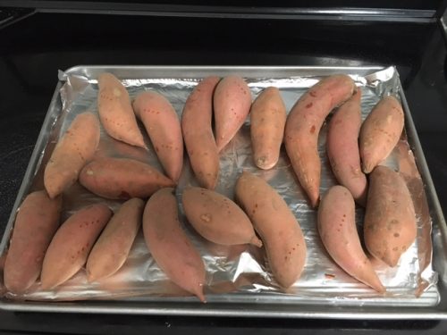 Start out by cooking the sweet potatoes. You can boil them until soft, but I find it easier just to throw them on a baking tray at 400F for about 40 to 45 minutes. Allow the cooked sweet potatoes to cool completely before pureeing them in the food processor.