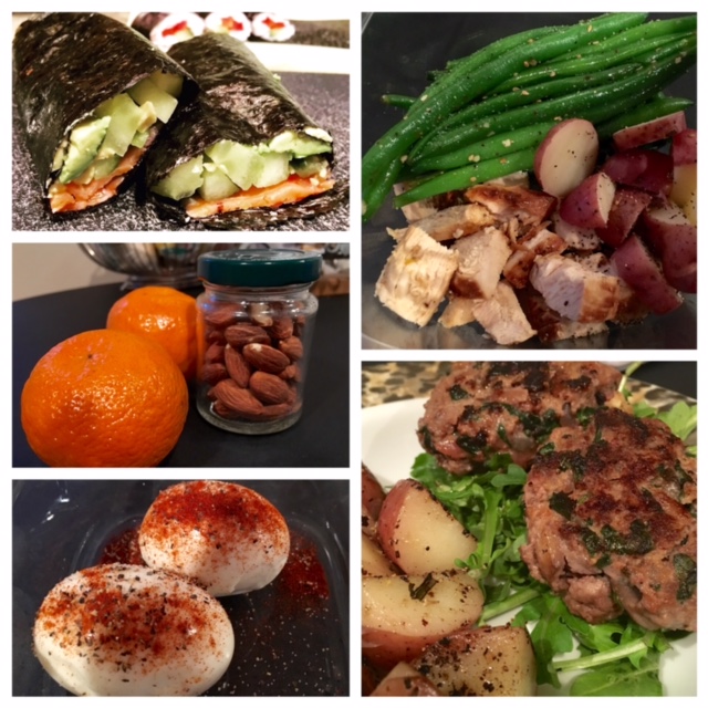 - Bottom right: dinner- grass fed organic beef burgers on top of arugula salad with a side of the same boiled red potatoes pan fried in coconut oil, garlic, and rosemary.